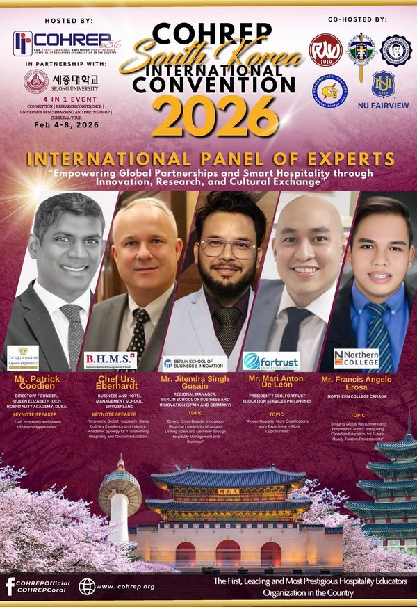 The COHREP is proud to announce the upcoming annual convention, set to take place on January 30-31, 2025 at the fabulous Grand ballroom of the Okada Manila. This year’s convention, themed "Exploring Horizons, Empowering Futures: The Paradigm Shifts to the Hospitality and Tourism Landscapes”, aims to bring together educators, administrators, policy makers, and thought leaders from across the Philippines and beyond to explore transformative practices in the hospitality and tourism education.